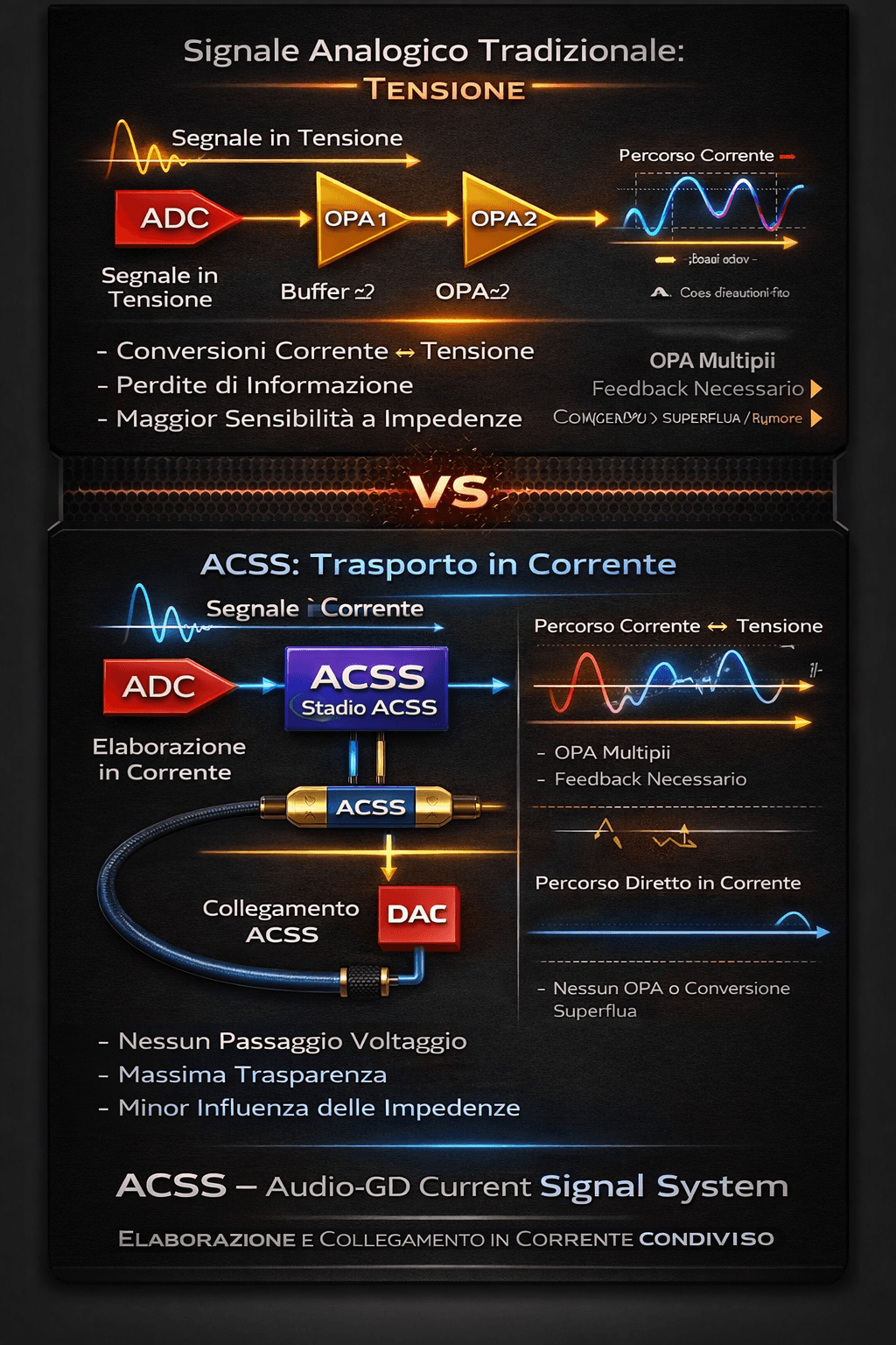 L’ACSS (Audio-GD Current Signal System) è la reinterpretazione proprietaria, sviluppata da Kingwa, della Current Conveyor Technology, una famiglia di soluzioni circuitali che lavora nel dominio della corrente anziché della tensione.